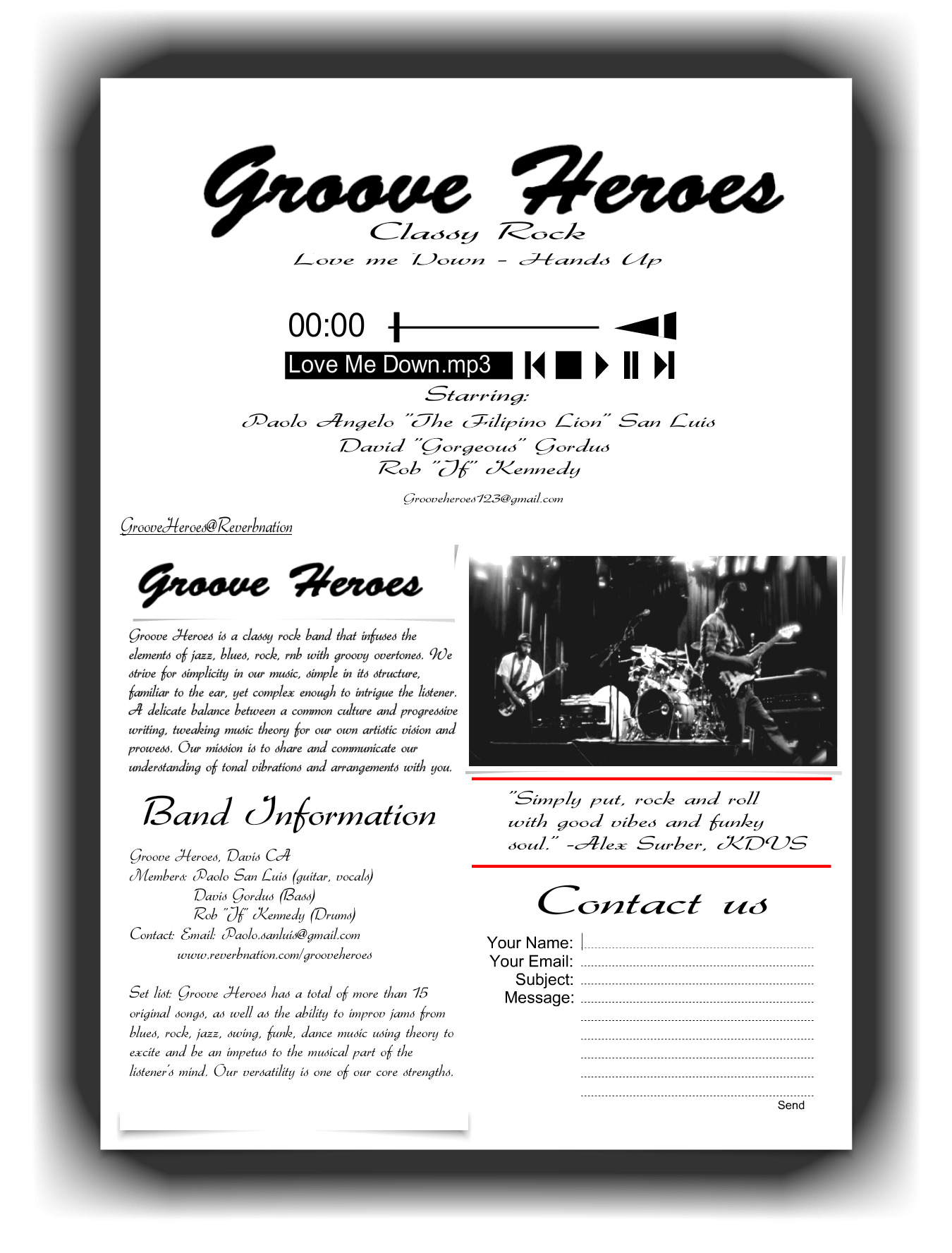 Смотрите, сначала крупно написано название коллектива — это ок. Ниже заметный работающий аудиоплеер с удобными нормального размера кнопками и ползунком громкости. Список участников. Текст — короткий и по делу. Классная фотка. Одна убедительная цитата. Форма обратной связи (работающая).